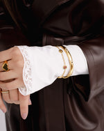 Mystic Eye Bangle features delicate evil eye details in gold with subtle sparkle. Crafted from non-tarnish stainless steel, perfect for everyday layering or wearing solo for a bold, elegant touch.