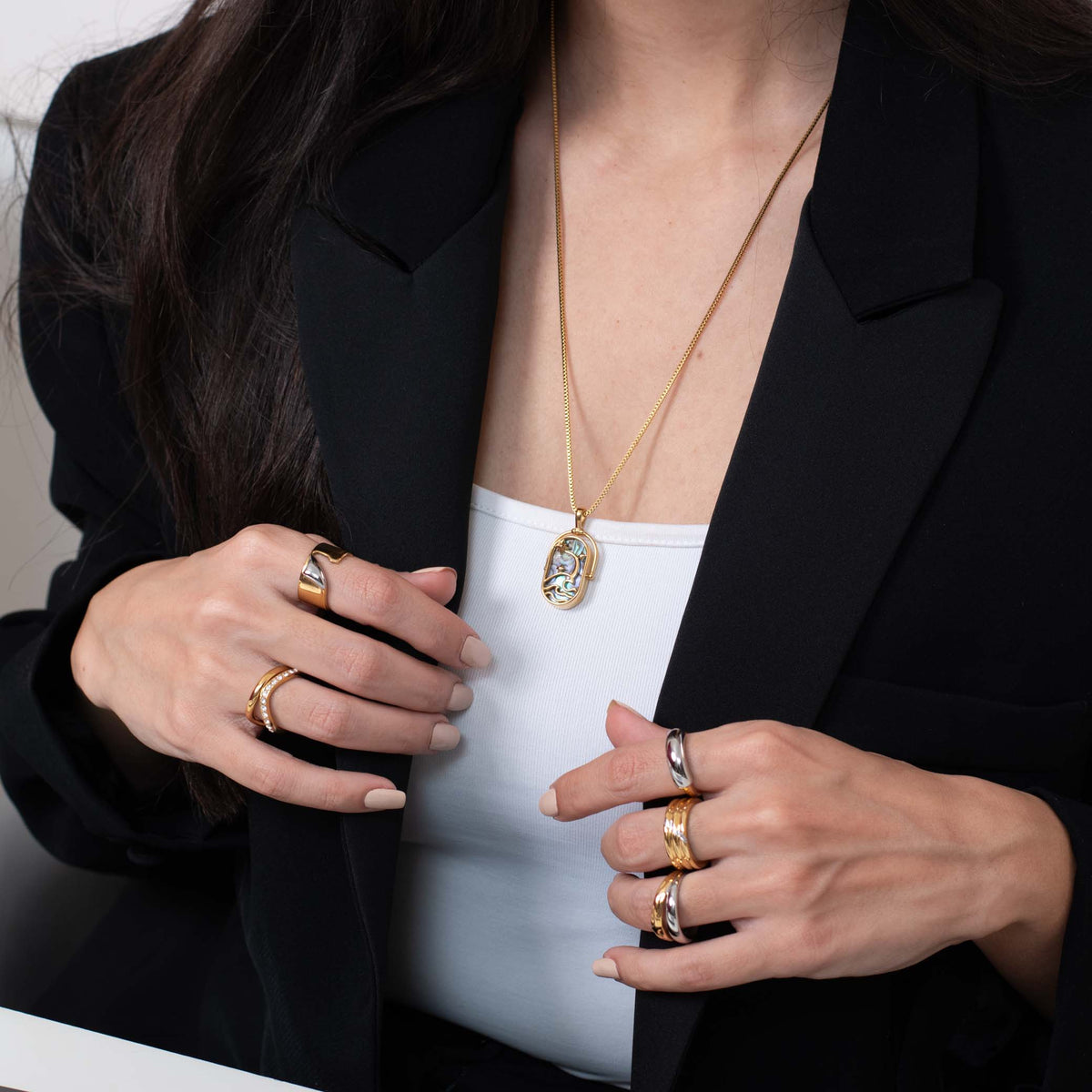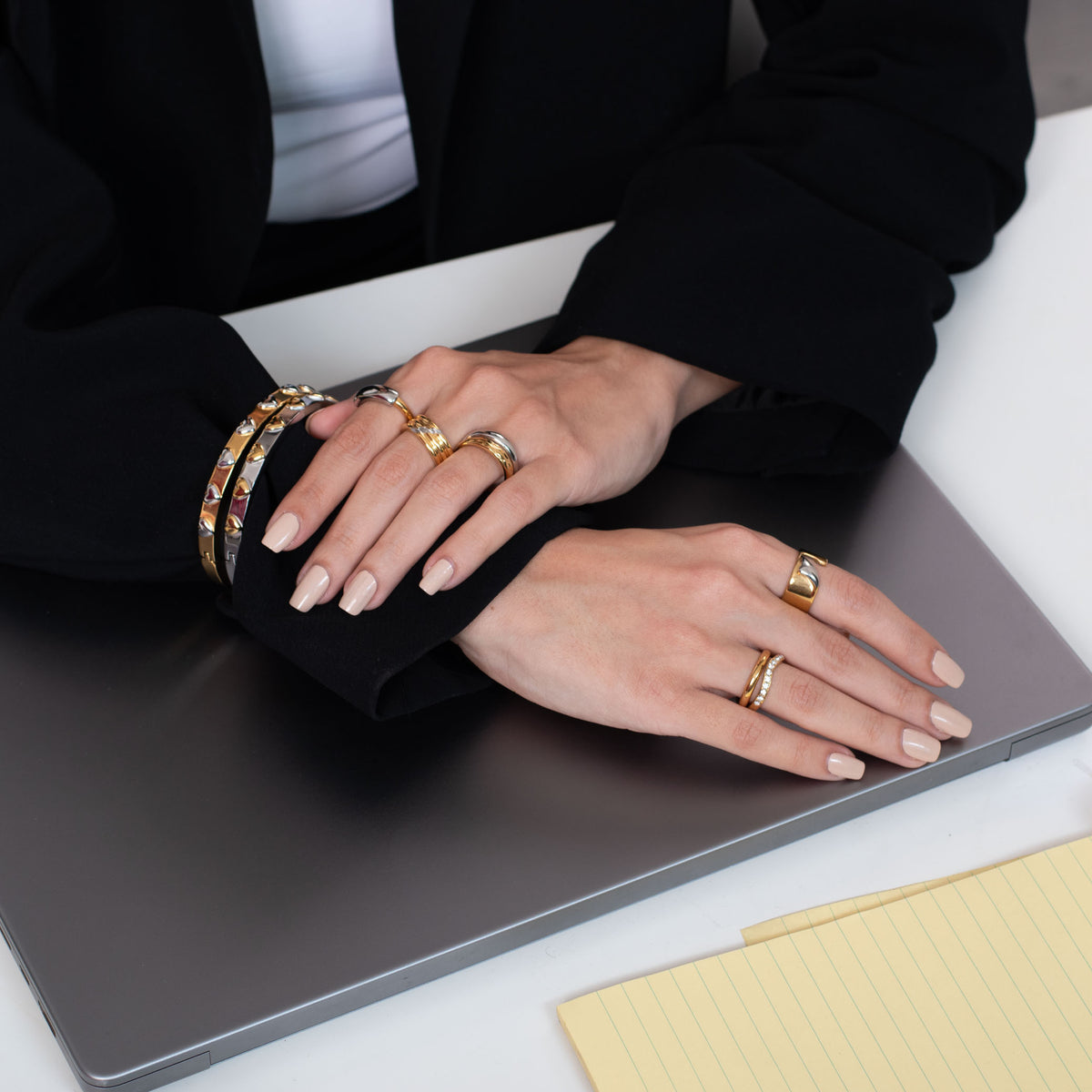 A bold mixed-metal statement in one sleek piece. The Fold Ring features a fluid gold-and-silver design crafted from non-tarnish stainless steel, making it the perfect modern accessory to elevate any work outfit with effortless edge.